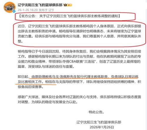 剛剛,遼寧隊宣布了一則重要消息,球隊主教練楊鳴正式向球隊申請辭職,遼寧隊與之進行充分溝通後,同意楊鳴辭職,與此同時,遼寧隊助理教練烏戈·洛佩斯,將會成為遼寧隊代理主教練,帶領遼寧隊參加接下來的CBA聯賽。