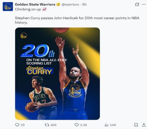 這場比賽後庫裏常規賽得分26397分超過哈夫利切克,和皮爾斯並列曆史第19,距離第18位的鄧肯還差99分,庫裏迎來了裏程碑的夜晚。