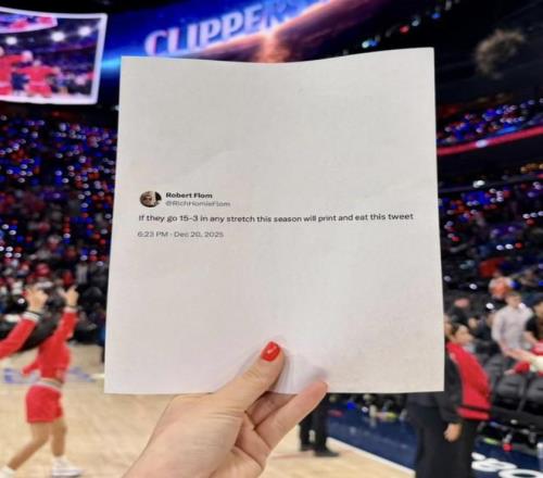 此前,有一位網友在推特上發文表示:“如果快船在本賽季任意階段打出18場贏15場的表現,他就把那條推文打印出來並吃掉。”