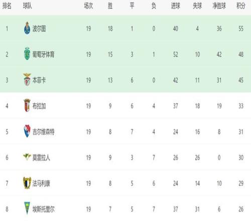 本場過後,波爾圖在葡超已經實現11連勝,上一次他們在聯賽中丟分,還是在主場戰平本菲卡,這也是賽季至今,波爾圖在葡超唯一一場沒贏的比賽,其他18場全勝。幾乎完美的發揮,讓波爾圖在積分榜上遙遙領先。如今排名第二的葡萄牙體育,落後波爾圖7分,根本無力威脅領頭羊的位置。