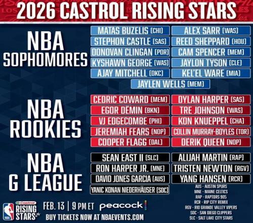 NBA官方公布了今年全明星新秀賽的完整名單,其中一年級新秀和二年級新秀一共21人入選,其中新科狀元弗拉格領銜新秀名單,二年級則由去年榜眼薩爾領銜,狀元裏薩謝則落選。此外,發展聯盟還有7人入選,其中楊瀚森代表撕裂之城混音入選。今年的全明星新秀賽還是延續此前的賽製,21名NBA一二年級新秀,分成三支球隊,7名G聯賽代表組成一支球隊,進行錦標賽對決。