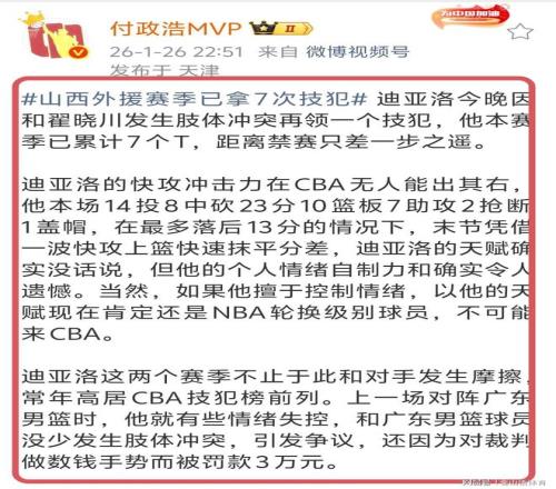 迪亞洛累計7次技術犯規,著名媒體人付政浩發文表示:迪亞洛本賽季已累計7個T,距離禁賽隻差一步之遙……迪亞洛的天賦確實沒話說,但他的個人情緒自製力和確實令人遺憾。當然,如果他擅於控製情緒,以他的天賦現在肯定還是NBA輪換級別球員,不可能來CBA。迪亞洛這兩個賽季不止於此和對手發生摩擦,常年高居CBA技犯榜前列。上一場對陣男籃時,他就有些情緒失控,和廣東男籃球員沒少發生肢體衝突,引發爭議,還因為對裁判做數錢手勢而被罰款3萬元……