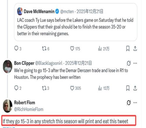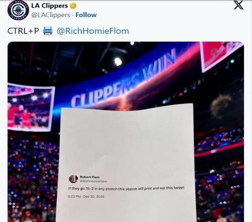 這件事的起因還要追溯到一個多月前,快船主帥泰倫-盧曾在12月21日表示,他向球隊提出了剩餘賽程拿下35勝20負的目標。彼時,快船的戰績僅為6勝21負。弗洛姆當時在社媒上回應盧的這一目標時寫道:“如果快船本賽季能打出一波15勝3負的戰績,我就把這條推文打印出來吃掉。”