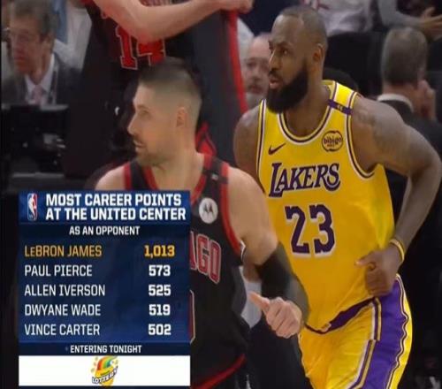 詹姆斯在末節比賽打破得分荒,但進攻威力依然伴隨體能下滑減弱。所幸,湖人還是擋住公牛反撲拿下勝利,詹姆斯也成為NBA曆史首位在芝加哥聯合中心,作為對手轟下超過1000分的球員,而排名第二的皮爾斯是573分,距離詹姆斯的紀錄相差甚遠。