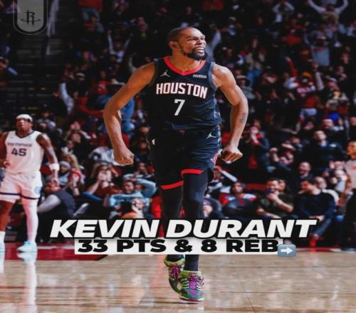 火箭老將凱文-杜蘭特發揮出色:首發出戰37分鍾,投籃24中11,三分9中4,罰球9中7,砍下33分8籃板2助攻1蓋帽2失誤。杜蘭特已經連續三場比賽砍下30+:36分、32分和33分,成為NBA曆史第五個在37歲後做到這點的球員。