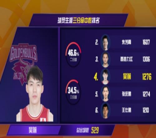 CBA曆史第4+現役第1!吳前1276三分超張慶鵬將追西熱力江_24直播網
