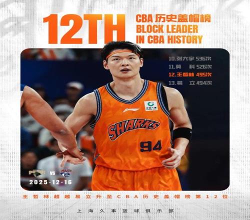 本賽季CBA常規賽第2輪,上海久事客場挑戰南京天之藍。王哲林在第二節送出個人第2次蓋帽,CBA生涯蓋帽總數上升至495次,超越易立的494次,升至CBA曆史蓋帽榜第12位。