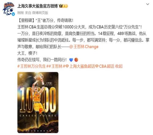 1月27日晚,上海男籃坐鎮主場迎戰廣州隊,球隊中鋒王哲林在一次進攻中強突籃下打成2+1,CBA生涯總得分突破10000分。