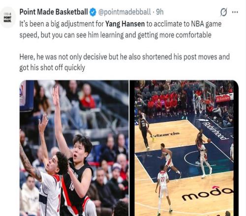 美媒:對於楊瀚森來說適應NBA的節奏是一大挑戰,但你能看到他似乎已經逐漸適應了NBA的速率/節奏。他在防守端不斷提速,而且在出手前縮短了跑動距離,從而很迅速的完成出手。