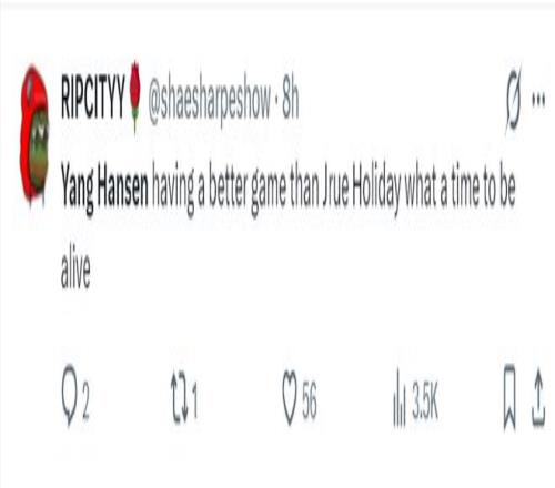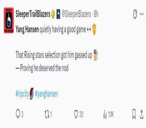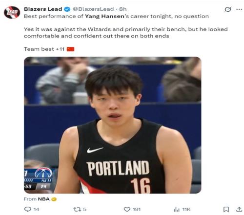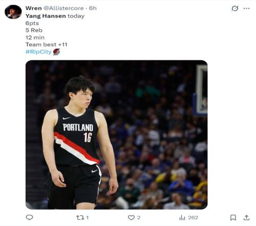 開拓者球迷:楊瀚森真的表現很好,他終於看起來像一個NBA球員了,繼續保持下去吧。