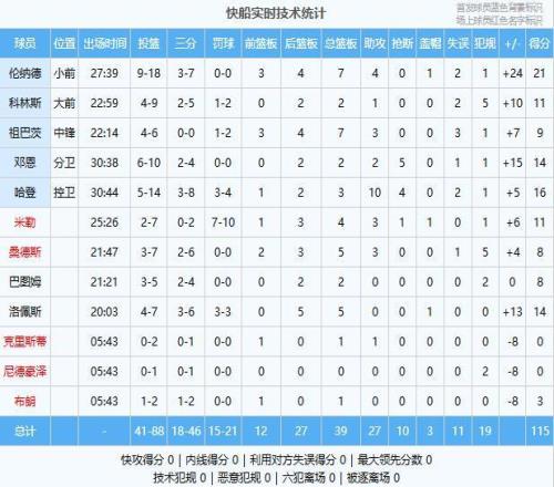 下場快船防守升級鄧恩連續搶斷反擊快船一度將領先擴大到19分,而後爵士始終無法有效反擊,三節結束後快船已經領先15分,末節上來,爵士無法打出追分高潮逆轉無望,兩隊陸續換上替補陣容,最終快船115-103擊敗對手迎來三連勝。