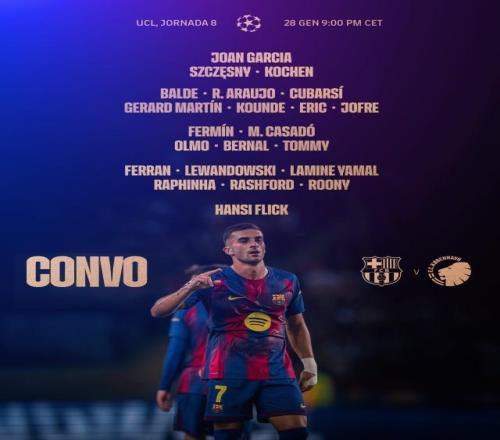 歐冠聯賽階段第8輪,巴塞羅那主場迎戰哥本哈根。紅藍軍團公布大名單,亞馬爾、拉菲尼亞、萊萬領銜,費蘭回歸,阿勞霍在列。 巴薩大名單 門將:霍安·加西亞、什琴斯尼、科琴 後衛:亞曆克斯·巴爾德、阿勞霍、庫巴西、赫拉德·馬丁、孔德、埃裏克·加西亞、托倫茨 中場:費爾明、卡薩多、奧爾莫、貝爾納爾、托米·馬克斯 前鋒:費蘭、萊萬多夫斯基、亞馬爾、拉菲尼亞、拉什福德、巴爾德吉