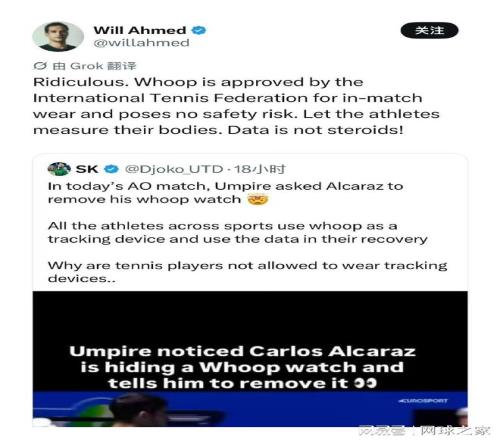 Whoop首席執行官在今天發文回應澳網禁止阿爾卡拉斯穿戴此設備一事時說道:“荒謬!Whoop已被國際網球聯合會批準用於比賽中穿著,且不構成安全風險。讓運動員測量他們的身體吧。數據不是類固醇!(之前辛納興奮劑事件)”