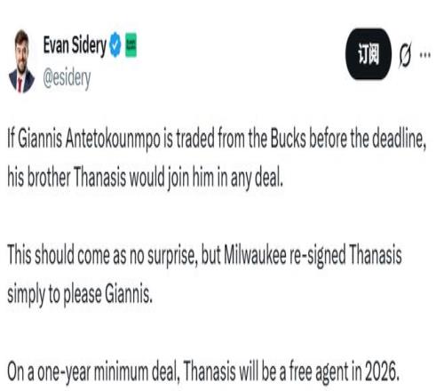 還有一些需要考慮的因素:有意引進字母哥的球隊,必須確認他願意在休賽期與球隊續約。自10月2日起,字母哥就有資格簽下一份為期四年、價值2.75億美元的續約合同。另外,無論字母哥被交易到哪支球隊,他的哥哥薩納西斯預計都會一起被打包。之前雄鹿用底薪簽下薩納西斯,也隻是為了取悅字母哥。