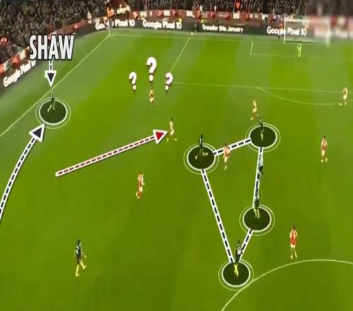 曼聯邊衛盧克·肖和迪奧古·達洛在外側跑位,迫使阿森納邊鋒不得不跟人,這樣的牽製,讓紅魔中場始終多出一人。