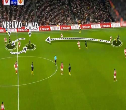 姆貝莫、阿馬德和B費在右路,也踢得非常高效。B費牽製了阿森納中衛薩利巴,但阿馬德和姆貝莫因此得到了在威脅區域接球的機會。因此,當曼聯進攻時,阿森納的防守陷入了真正的混亂。蘇比門迪的烏龍助攻,就是阿森納被逼進他們不想進入的領域的結果。