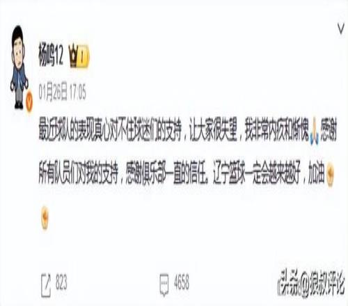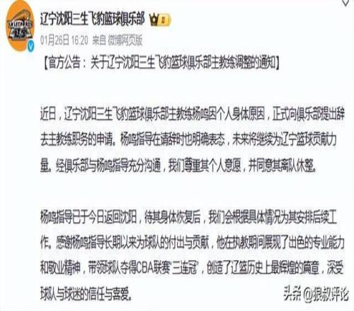 楊鳴個人選擇請辭,離開遼寧男籃主帥的位置。盡管俱樂部層麵全力挽留,但楊鳴離隊的心意已決,最終,這名遼寧男籃隊史成績最好的主教練,離開帥位。