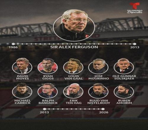最近Telemundo Deportes做了一張圖,把弗格森從1986年帶到2013年的那條時間線,和2013年之後曼聯“不斷換帥”的現實擺在一起。2013年到2026年,主帥(含臨時)一共換了10位:有人隻帶了3場、4場就走,也有人扛了兩三年但最後還是下課;獎杯這邊,能算得上“拿得出手”的,主要集中在莫耶斯那座社區盾、範加爾的足總杯、穆裏尼奧的三冠、滕哈赫的兩座杯賽冠軍上。隻看成績和榮譽,弗格森之後到底誰才是最成功的那一個?(數據截至2026年1月)