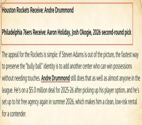美媒《Fadeaway World》撰文建議,火箭可以將霍勒迪、奧科吉以及2026年的次輪簽送到76人,換回這位昔日全明星中鋒。