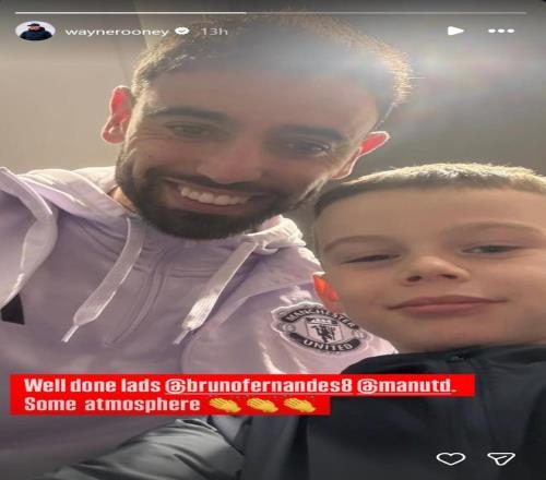 賽後,魯尼在社媒曬出了B費和自己小兒子的合影,並表揚了曼聯球員今天的表現:“做得好啊夥計們。”