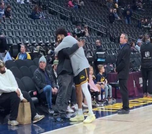 在掘金主場111-121雷霆的比賽前,賈馬爾-穆雷的父親在場邊擁抱兒子,慶祝他首次入選NBA全明星。