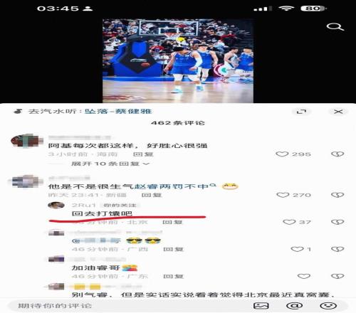賽後,在社交媒體上出現了批評北京和趙睿的內容,據網傳圖片顯示,北京後衛趙睿現身評論區,回複了兩名IP屬地新疆的球迷。