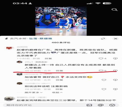 第二位球迷則批評北京:趙睿的巔峰在廣東,周琦在新疆,陳盈駿在省隊,紙麵實力不代表即戰力,廣廈還是穩一點,冠軍歸屬真沒北京啥事了。趙睿回複道:新疆邊上待一待,自己人民都沒有主觀思想,都是別人帶著跑。