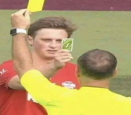這張梗圖的來源是2023年的一場明星網紅慈善賽,知名網紅Max Fosh因被抓到犯規,讓前英超裁判克拉滕伯格亮出一張黃牌警告,但Fosh出示了綠色反轉卡,引得現場大笑。
