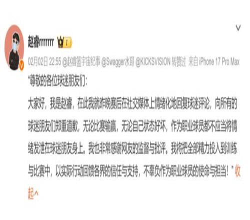 如此一來,趙睿終於又惹禍了,昨天一整天之內都有很多人去找他,跟他強調這個問題的嚴重性。終於在昨天傍晚,趙睿公開道歉,但還是被質疑不夠誠懇,並沒有專門向新疆球迷道歉。