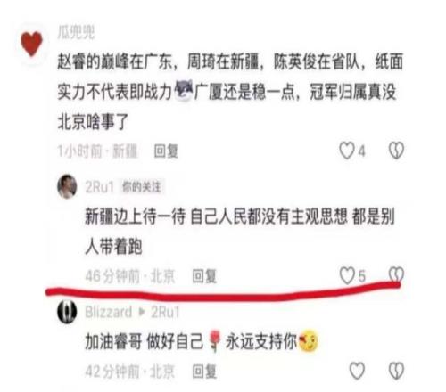 結果在賽後,氣急敗壞的趙睿打開了個人社媒賬號,開始跟球迷對線,其中就瞄準了IP在新疆的球迷,開始胡亂說話,一下子引起了新疆球迷的憤怒。更為關鍵的是,趙睿的措辭出現了很嚴重的錯誤,他針對的不僅僅是球迷,而是更廣大的群體。