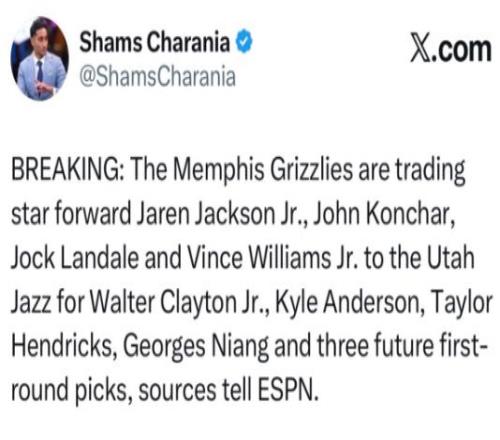 爆料王Shams:灰熊將3J+康查爾+蘭代爾+小文斯-威廉姆斯送至爵士,換回李凱爾+小克萊頓+亨德裏克斯+尼昂+三個首輪簽。