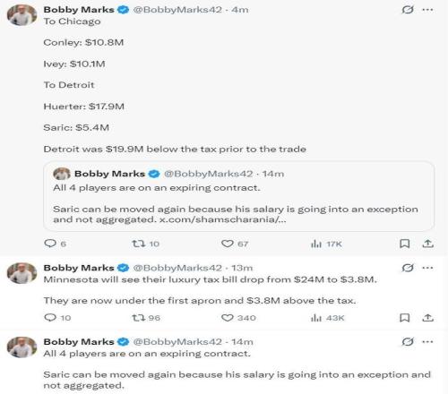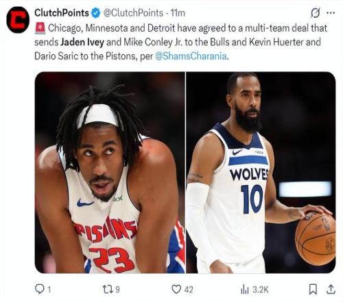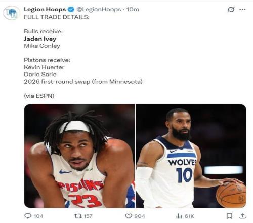 核心框架是:公牛送出23歲的後衛傑登·艾維,從森林狼得到38歲的控衛邁克·康利,活塞則從森林狼得到後衛凱文·赫爾特與前鋒達裏奧·薩裏奇,森林狼作為促成交易的一方,主要收獲是來自公牛的2026年首輪簽互換權以及一個價值250萬美元的交易特例。