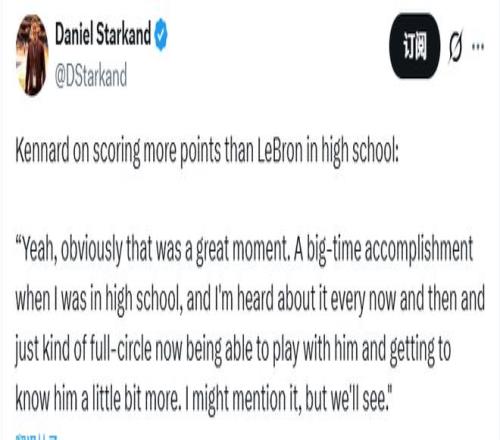 有美媒報道,肯納德高中生涯得到2977分,甚至高於詹姆斯的高中生涯(2657分)。談及高中時期得分比詹姆斯多,肯納德表示:“當然,那是段超棒的回憶,也是我高中時的一大成就。直到現在偶爾還會有人提起這事,如今能和他並肩作戰、慢慢更了解他,感覺一切都很圓滿。我或許會跟他提提這事,不過看情況吧。”