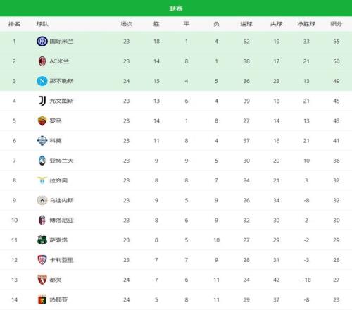 目前意甲積分榜如下:國際米蘭依舊領跑,18勝1平4負積55分,占據主動;AC米蘭以50分緊追其後;那不勒斯憑借這場極限絕殺來到49分,但比前兩名多賽一場,容錯空間並不大。尤文圖斯45分暫列第四,羅馬、科莫緊隨其後,爭四集團之間的差距不大,而亞特蘭大、拉齊奧的起伏表現,也讓歐戰資格之爭充滿變數。