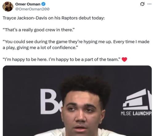 賽後TJD談及首秀表現時坦言:“猛龍是一支非常出色的隊伍,你們可以看到比賽中他們一直都在為我加油,每一次我完成快攻,他們都給我很大的信心,真的很高興來到這裏,成為團隊的一員。”