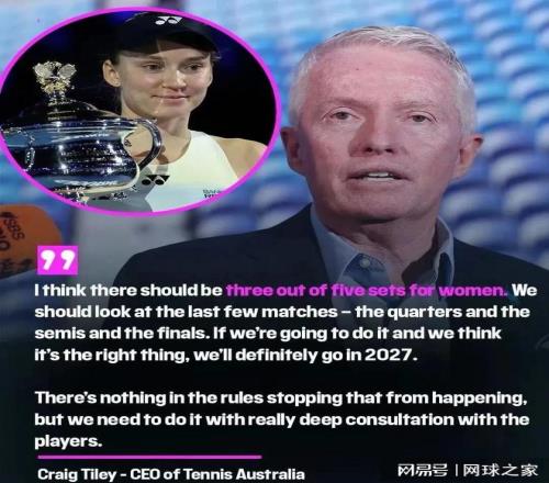 針對以上論調,澳網賽事總監克雷格·泰利表示,澳網有計劃在2027年試行從1/4決賽開始,可能會要求女子比賽采用五盤三勝製,不過這項改革還需要與球員進行深入的探討和協商。