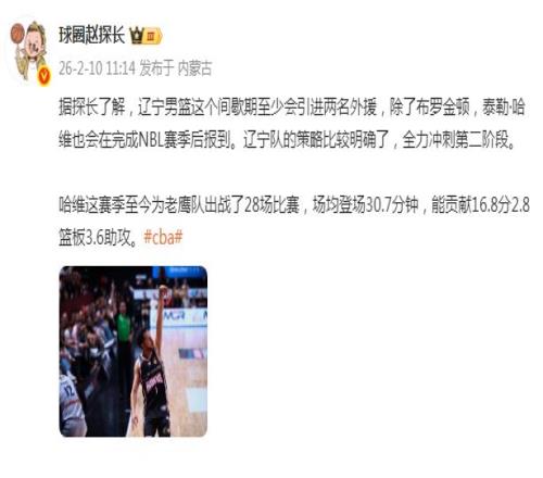 除此之外,根據媒體人球圈趙探長報道,遼寧男籃會在間歇期至少引進兩位外援,分別是NBL舊將艾澤亞-布羅金頓,以及另一位效力NBL的外援泰勒-哈維。