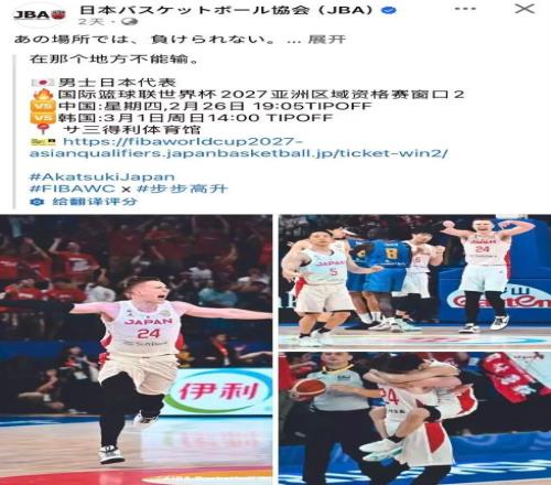 日本官方列出了世預賽對陣中國男籃和韓國隊的比賽時間,並且寫道:“在那個地方絕對不能輸。”