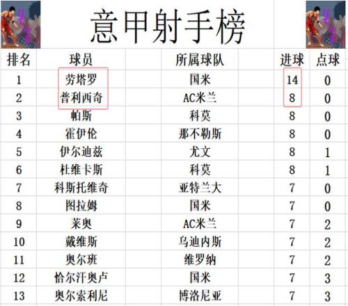 射手榜方麵,勞塔羅14球繼續領跑,普利西奇今天傷愈複出,隻不過替補登場未能進球,還是和帕斯,霍伊倫,伊爾迪茲,杜維卡斯等人8球並列第2。