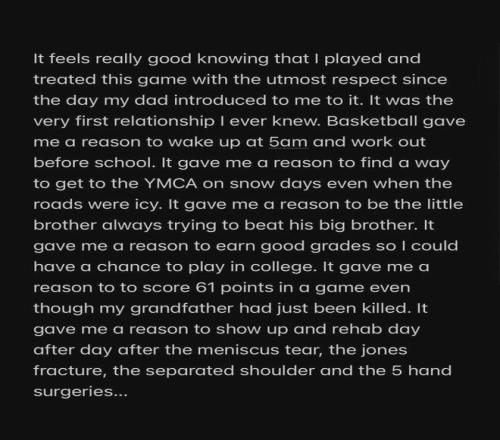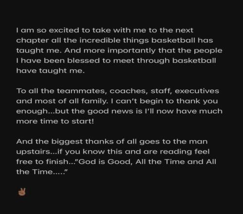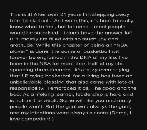 作為"NBA球員"的這一篇章已經結束,但籃球這項運動,早已刻進我的DNA,永遠不會離開我。