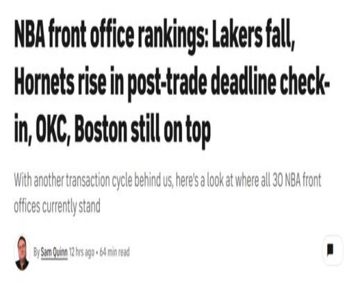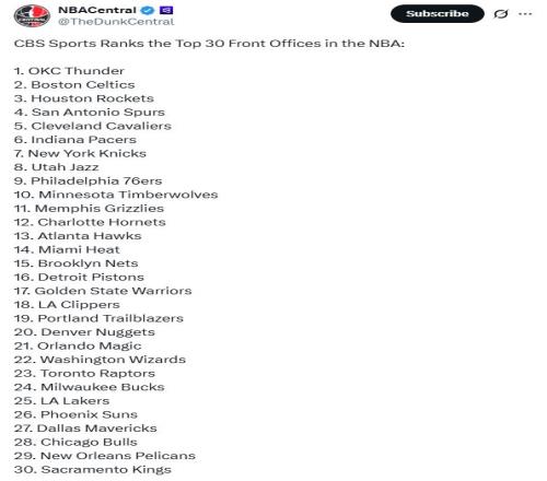 常規賽過半進入全明星周末之際,美媒《CBS》根據本賽季前半程最新表現重新評價NBA各隊管理層水平排名,其中雷霆隊毫無疑問高居第一,陷入困境的火箭隊仍高居第3,勇士隊17名,湖人僅排25位。