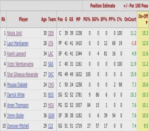 本賽季NBA球員on-off值(在場與離場時百回合正負值的差值),前五名如下:1、約基奇,15.3;2、馬爾卡寧,12;3、倫納德,11.6;4、文班亞馬,11.2;5、亞曆山大,11。沒想到吧?馬爾卡寧居然能排聯盟第二!
