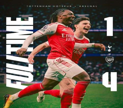 2球落後,圖多爾沒有猶豫立馬換上索蘭克、裏沙利鬆和特爾做最後一搏;第83分鍾,斯彭斯右路一對一強行突破橫傳,裏沙利鬆腳後跟嗑向球門,拉亞在皮球即將越過門線前將球撈回,熱刺險些追回一球。第94分鍾,馬丁內利積極反搶斷球,馬杜埃凱順勢分球,厄德高果斷直塞,哲凱賴什頂開格雷後捅射一樣梅開二度,4:1!最終在埃澤和哲凱雙雙梅開二度下,阿森納本賽季雙殺熱刺,第一次在英超對熱刺拿下4連勝;目前槍手多賽1場暫且領先曼城5分。