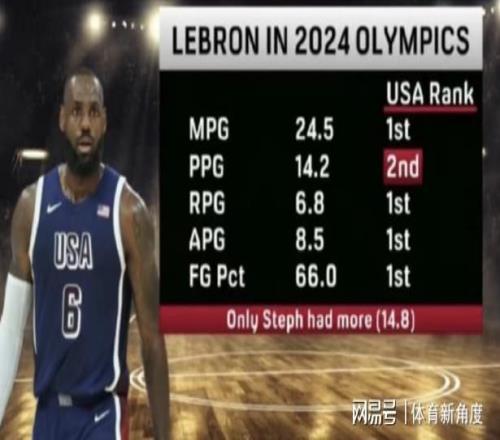 再把時光倒回前兩年,2024年巴黎奧運會那可是熱鬧非凡。詹姆斯在奧運會上那簡直就是“超級大魔王”般的存在,開幕式上,他昂首挺胸地舉著美國隊的旗幟,那仿佛整個世界都在他腳下。而且,他還榮獲了美國隊最佳運動員的稱號,就像遊戲裏的MVP一樣閃耀。在賽場上,他場均上場24.5分鍾,妥妥的隊內“勞模”第一名;場均能砍下14.2分,是隊裏的得分“二把手”;場均抓下6.8個籃板,籃板王非他莫屬;場均送出8.5次助攻,傳球大師的名號可不是白叫的;投籃命中率高達66%,這命中率,就像開了掛一樣準。