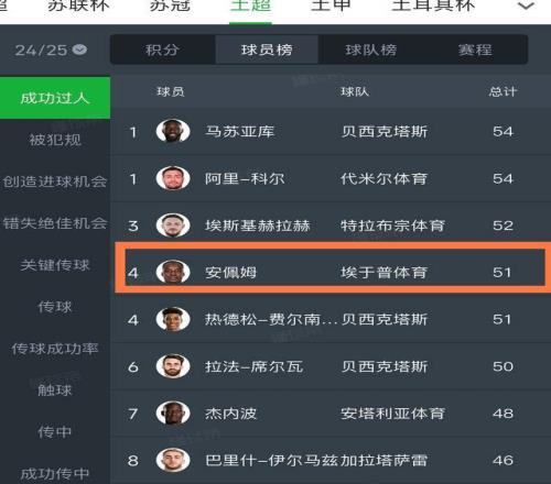 第一個,上賽季土超聯賽,安佩姆是整個土超成功過人榜第4名,整個賽季完成51次成功過人,和他並列的是1800萬歐的葡萄牙中場熱德鬆-費爾南德斯,他曾在英超熱刺踢過球的,你就知道安佩姆的過人能力了。雖然安佩姆隻有150萬歐,但是他的價值不輸1800萬歐英超級別的球星。