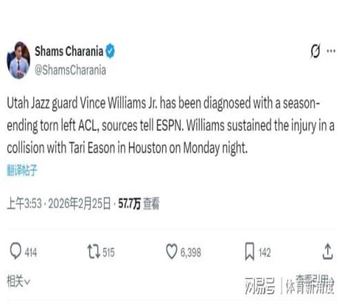 賽後-威廉姆斯接受了核磁共振檢查,結果令人痛心——他左膝蓋十字韌帶撕裂,這不僅意味著他本賽季報銷,更可能預示著他職業生涯的終結。文思是2022年選秀大會上的第47順位新秀,目前正處於新秀合同的最後一年,既未獲得提前續約,球隊也未流露出續約意向。他原本還想著在賽季末段奮力一搏,爭取留隊機會,如今卻一切成空。
