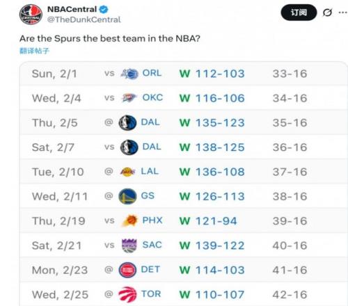 本場比賽,馬刺一度落後多達15分,以78-90落後12分進入末節。但球隊憑借深厚的底蘊強勢反撲,末節打出32-17的懸殊攻勢,單節淨勝15分,最終馬刺客場110-107逆轉猛龍,豪取聯盟現存最長的10連勝。同時,這也是馬刺自15-16賽季之後的第一個10連勝,那個時候他們拿到13連勝。值得一提的是,明天馬刺將對陣籃網,這是他們二月份最後一場比賽,如果不爆冷,馬刺將在2月拿到11勝0負的戰績!賽後,美媒NBA Central曬出馬刺最近10場的戰績,並發出靈魂拷問:“馬刺是聯盟最強球隊嗎?”