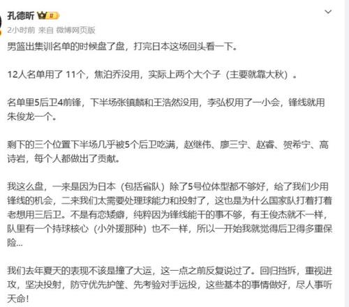 孔德昕一針見血說出了中國隊目前的最大短板,別看中國隊的三四號位不缺高度,但不論是王浩然還是張鎮麟、曾凡博,都沒有持球進攻的能力,說白了都是隻是鋒線藍領,隻能接球投安全球,無法在高壓防守強度下穩定得分,更別說接過球權自己開幹了,當然,王浩然、李弘權畢竟是頭一次代表中國隊打大賽,第一場表現低迷情有可原,而張鎮麟已經代表國家隊打了不少比賽,他的表現始終讓人不放心,這就有點不應該了。