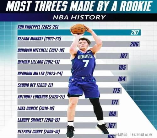 需特別指出的是,自2026年起,NBA三分球命中總數排名前三的球員中,有黃蜂隊一員。黃蜂隊的表現確實令人刮目相看!今日,克尼普爾三分球12投8中,加上這8記三分,其本賽季三分球命中總數已達209記,成功超越基根-穆雷。在命中這一記三分後,克尼普爾追平了基根-穆雷的新秀單賽季三分球紀錄(此前為206記)。而這一記三分,更使克尼普爾榮登NBA曆史新秀三分王寶座。