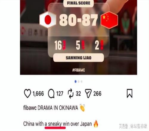 而就在今天淩晨,國際籃聯官網在戰報中用中國隊“從日本偷走一場勝利”來形容這場比賽的結果。這一表述引發了球迷的極大憤慨。中國隊是在客場完成翻盤,用“偷”來形容顯得格外刺耳。國外論壇同樣有聲音質疑這一措辭是否失當。幾個小時後,國際籃聯官網將這段文字改為“下半場完成逆轉並帶走勝利”。